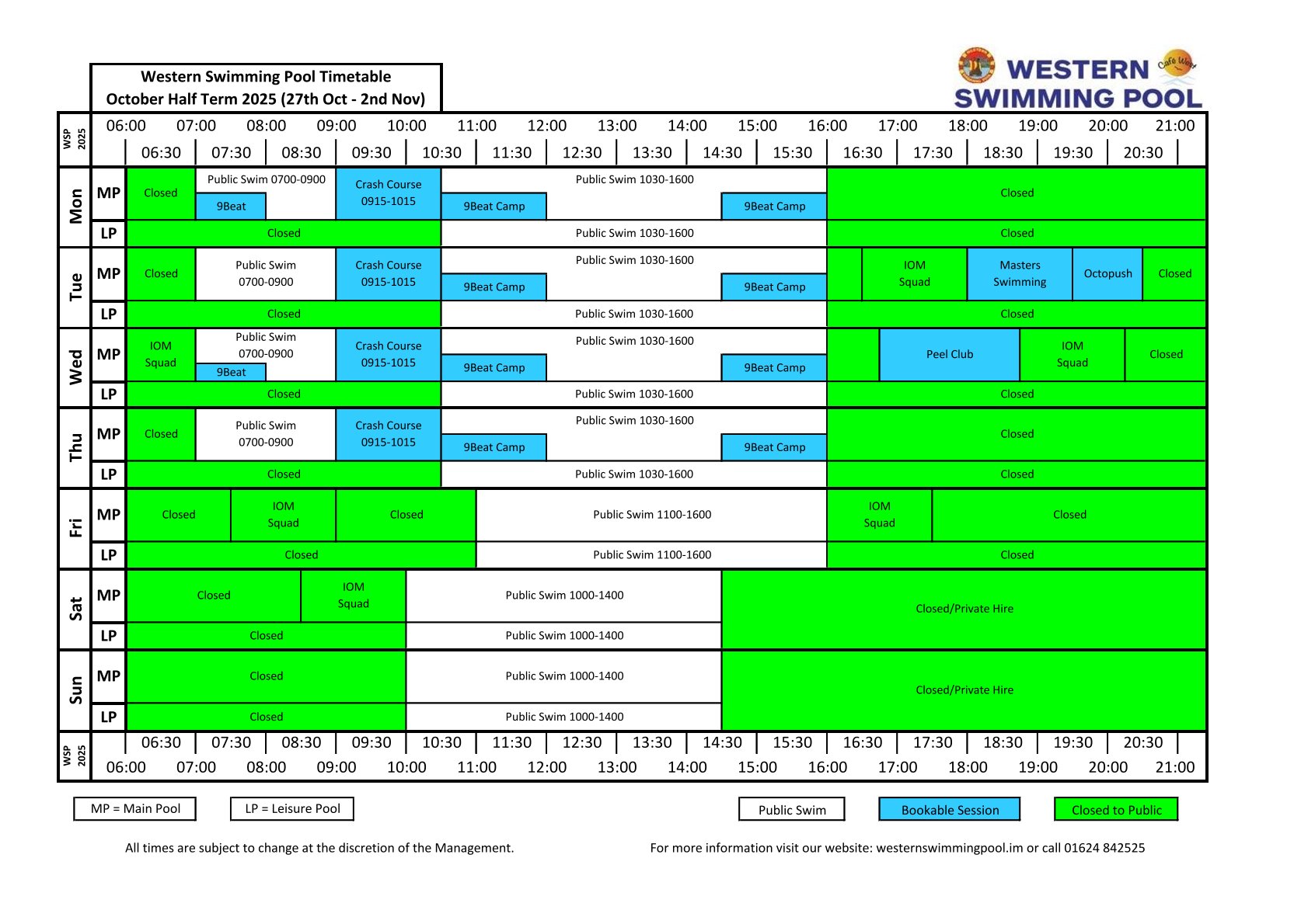 Main Pool: 3rd Sep-26th Oct (*Scroll down for Leisure Pool*)
